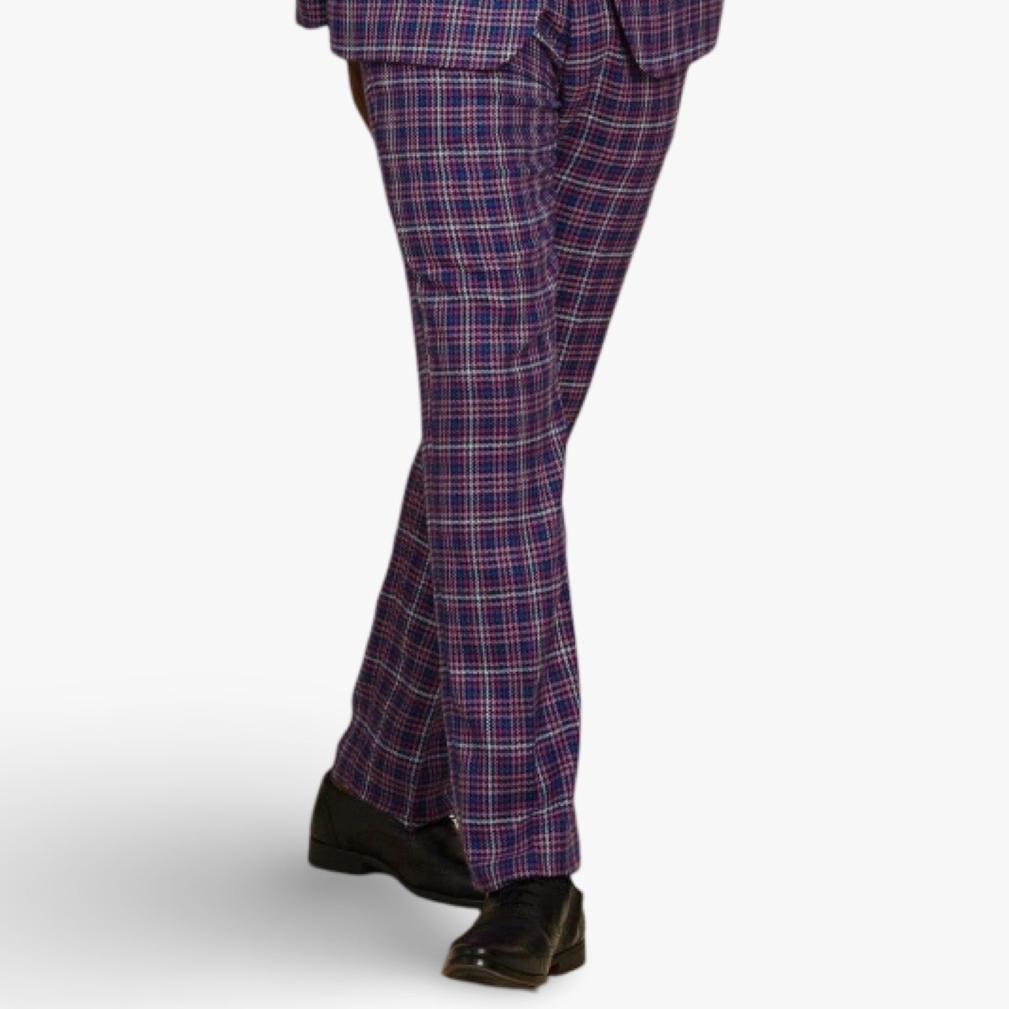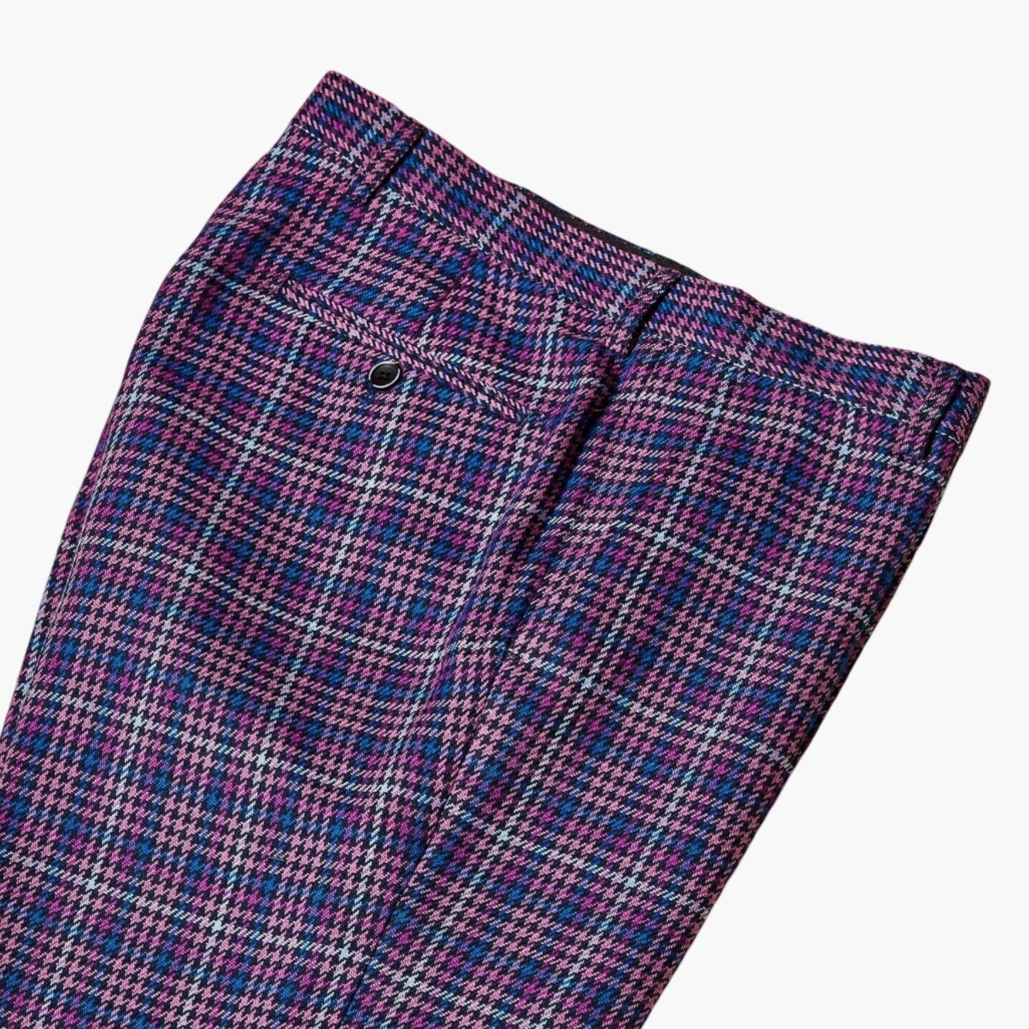 Upgrade your wardrobe with the Men’s Purple Houndstooth Flat Front Pants by Inserch. Crafted from a premium blend of 65% polyester and 35% rayon, these stylish flat-front pants offer a perfect balance of comfort and sophistication. Featuring a vibrant purple houndstooth pattern, these pants are ideal for formal occasions or making a bold fashion statement.
