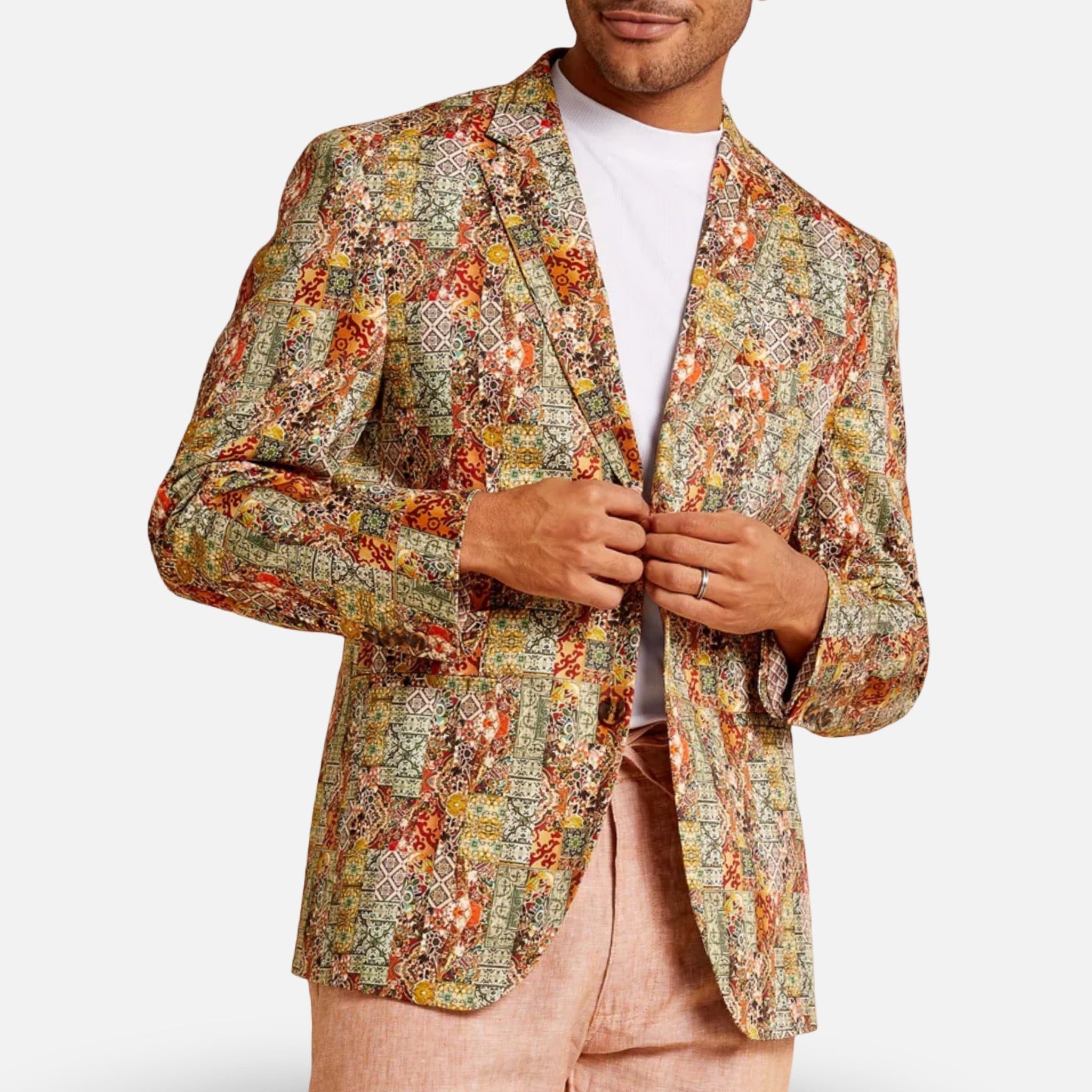 Add a splash of artistic flair to your wardrobe with this Rust Mosaic Print Blazer by Inserch. Made from 100% cotton, this modern fit blazer features a rich patchwork of Mediterranean-inspired patterns in warm tones of rust, olive, mustard, and burgundy.
