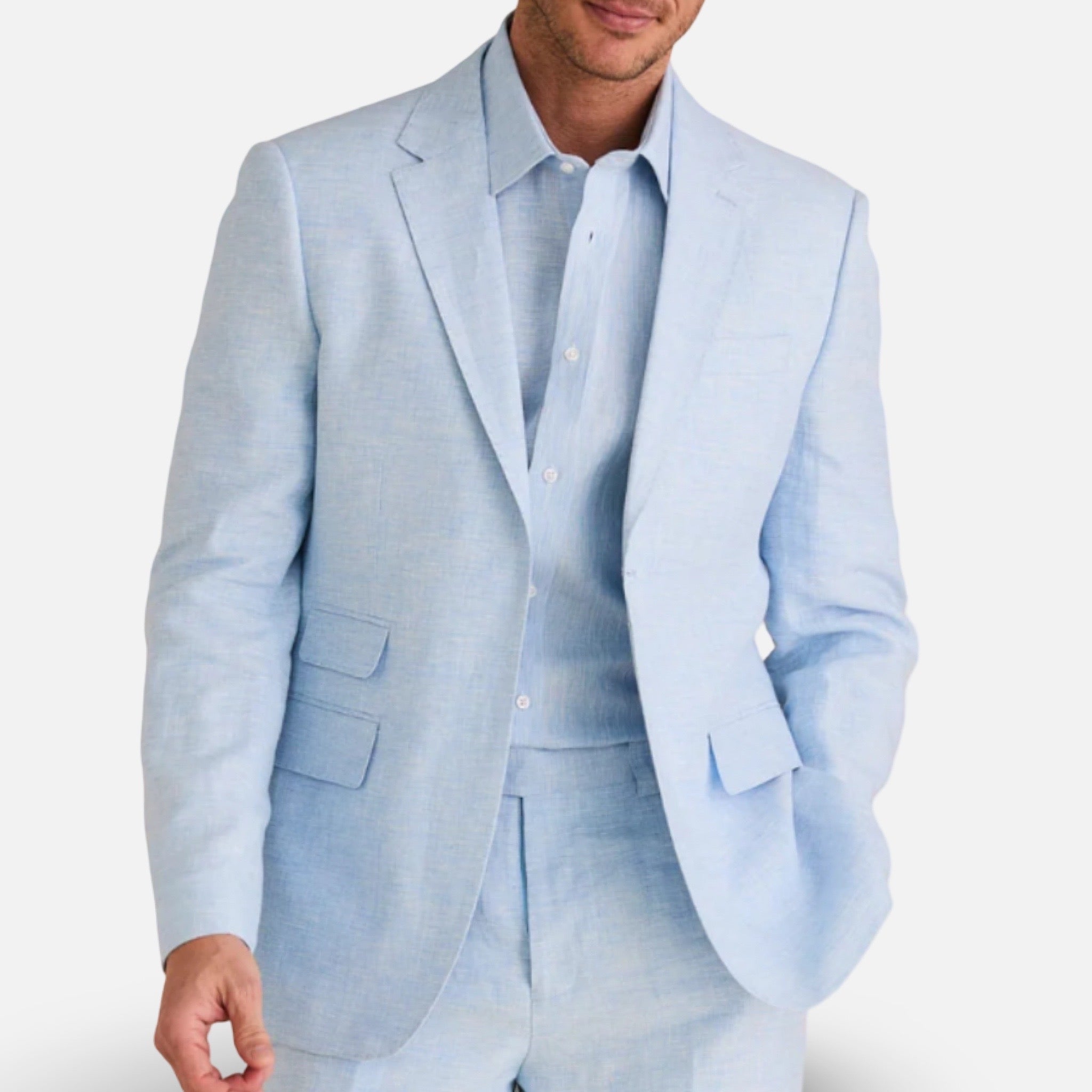 The soft pastel blue shade adds a refreshing and elegant touch to your look, making it perfect for beach weddings, garden parties, and resort dinners. Designed with notch lapels, flap pockets, and a sleek silhouette, this blazer brings polished sophistication with a relaxed vibe.