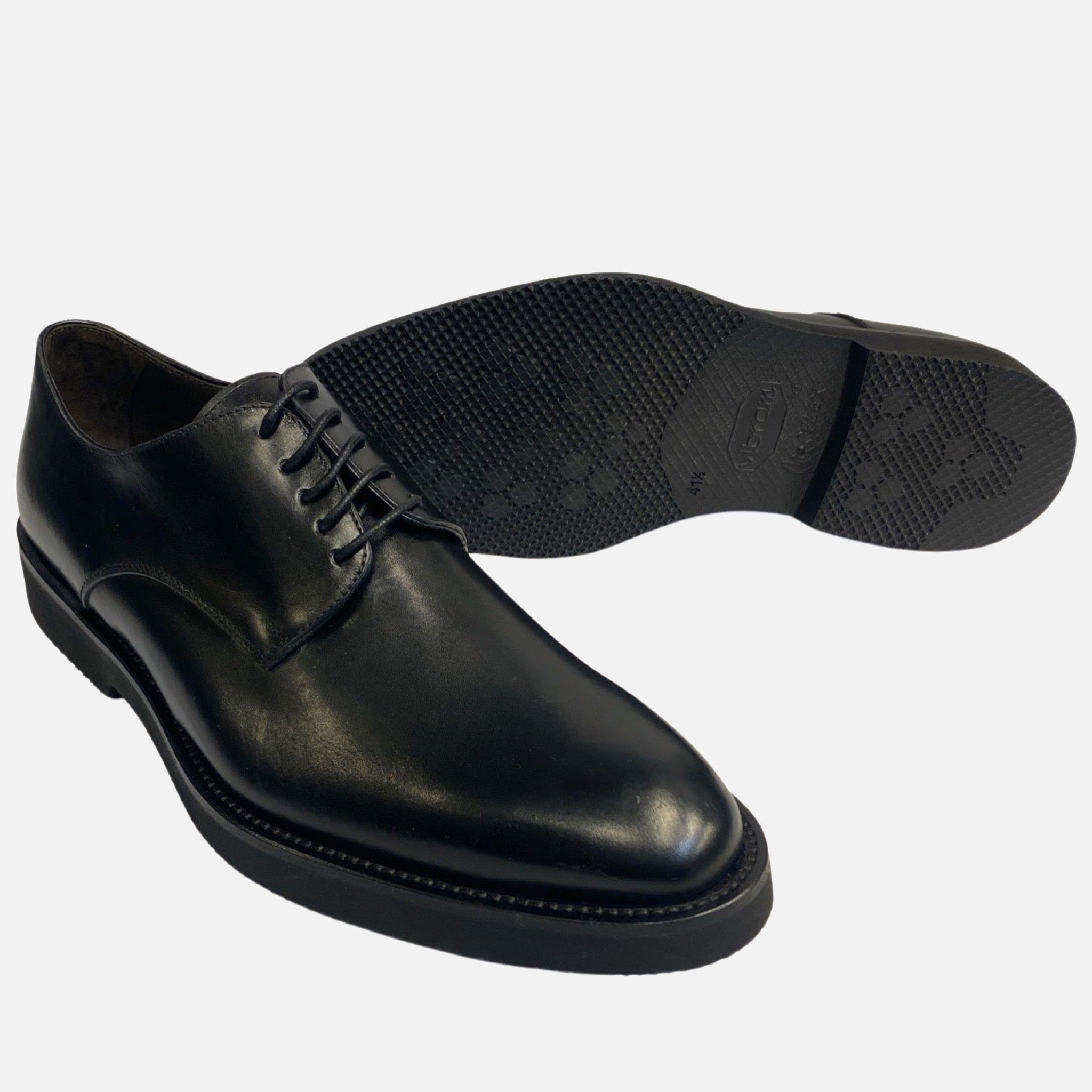 Introducing the La Ferra Black Italian Plain Toe Shoe, a versatile masterpiece designed for both dressing up and down. Handcrafted with precision in Italy, these shoes exude timeless elegance. The plain toe design adds a touch of sophistication, making them suitable for a range of occasions. The Vibram outsole not only ensures durability but also provides reliable traction, offering comfort and stability whether you're dressing for business or casual affairs. Elevate your style with La Ferra, where Italian craftsmanship meets the flexibility to seamlessly transition from formal to relaxed settings.