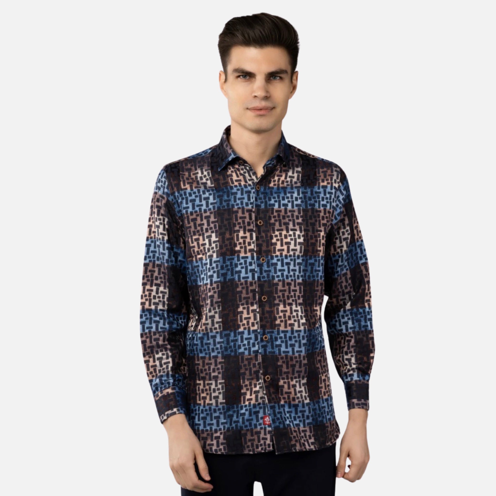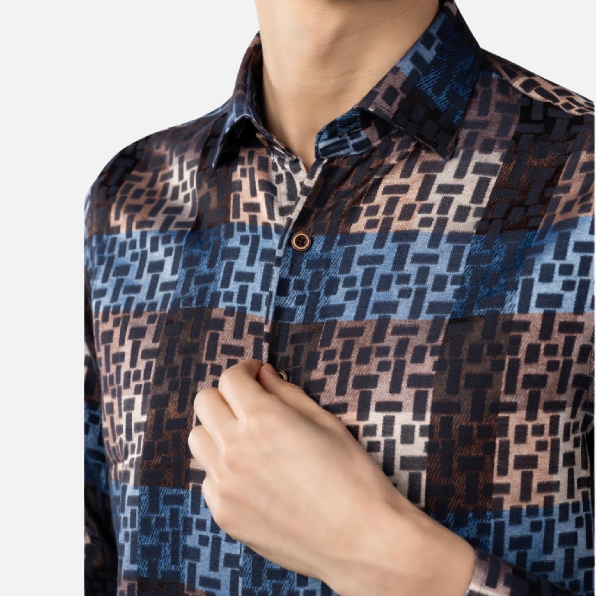 Add a touch of sophistication to your wardrobe with the Luchiano Shirt 4975 Brown and Blue Stripes with Navy Shape Satin Jacquard, where luxury, distinctive design, and a blend of cotton and polyester create a shirt that embodies timeless style for any occasion.