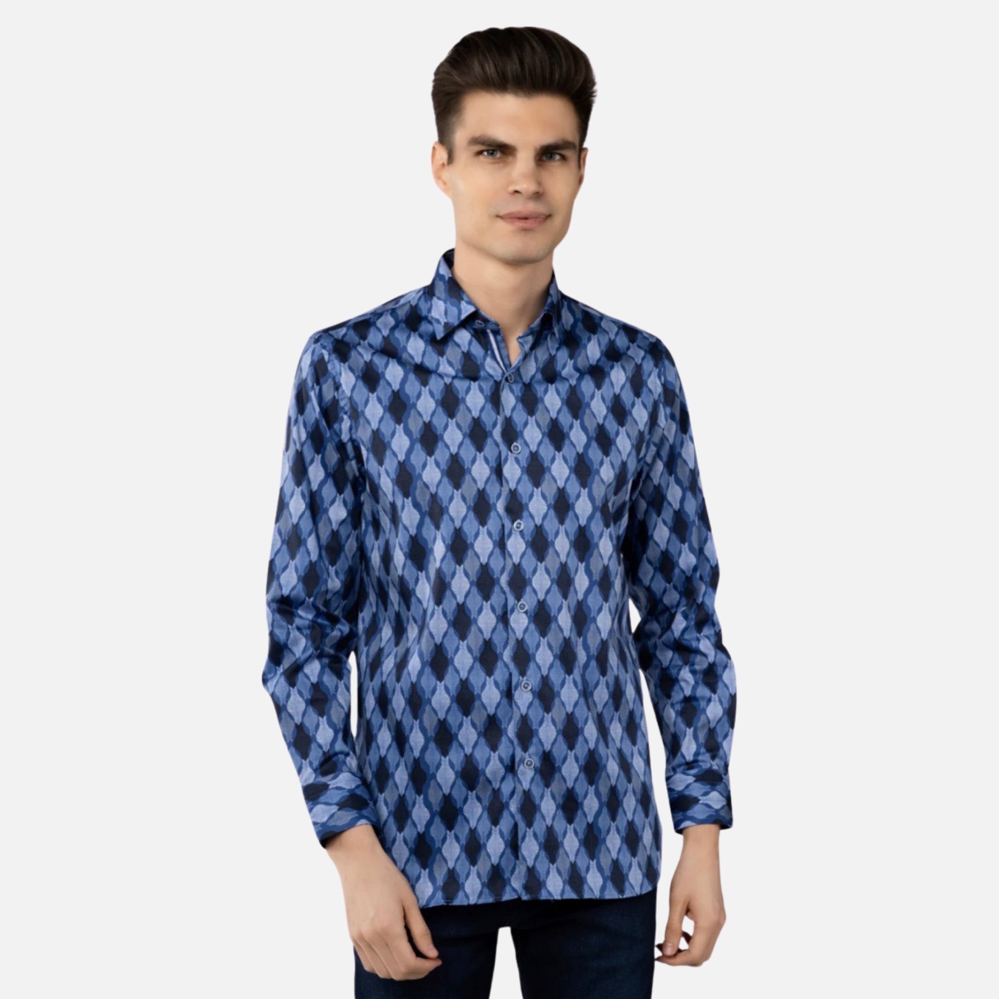 Experience the luxury and sophistication of Luchiano Visconti with the Sapphire Blue Daggered Swirl Shirt, where craftsmanship meets elegance, creating a button-down sport shirt that complements the modern man's desire for style and comfort.