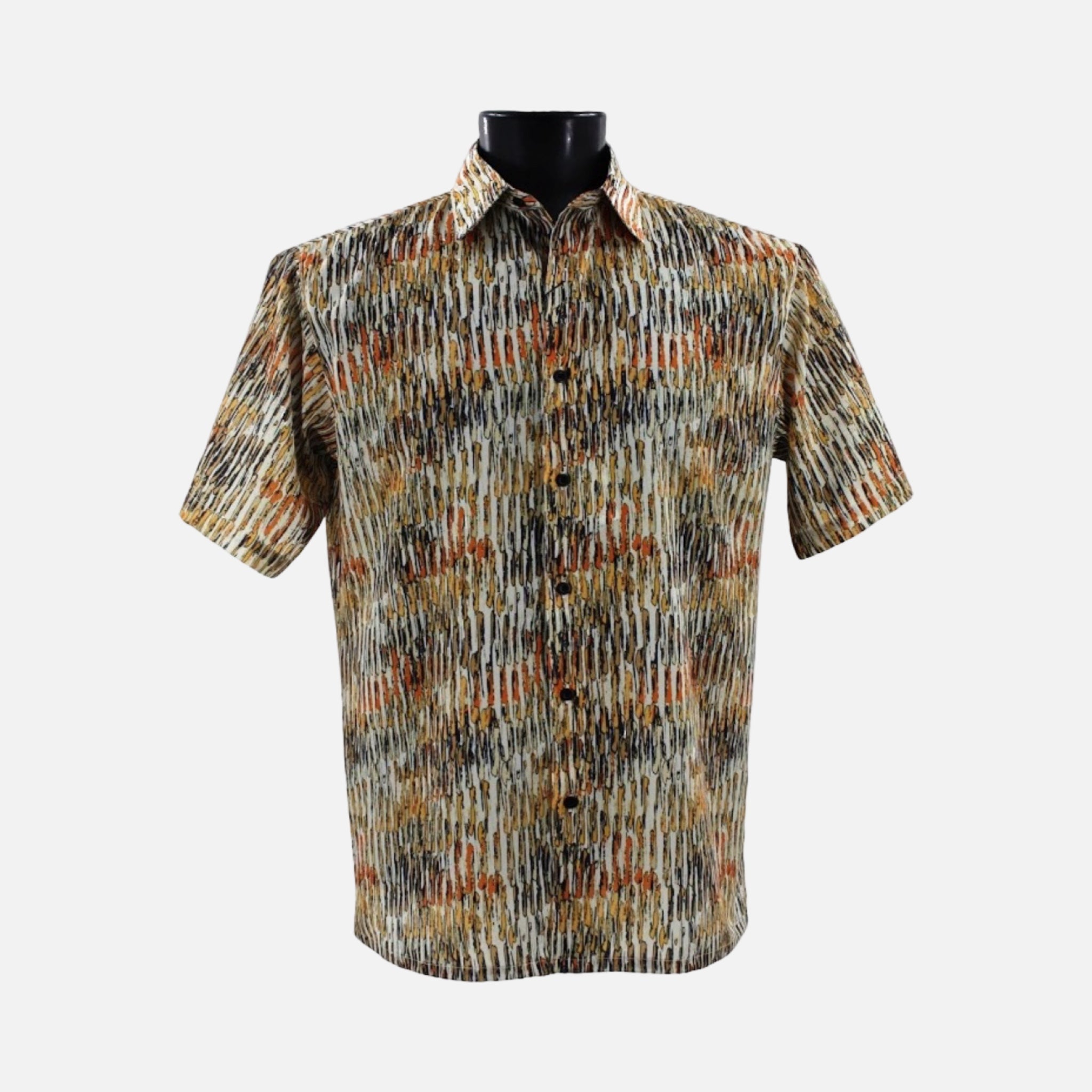 Elevate your style with this casual summer shirt by Bassiri. Abstract design, with lightweight microfiber fabrication. Blocked off bottom of shirt to wear untucked casually. Loose fitting style.