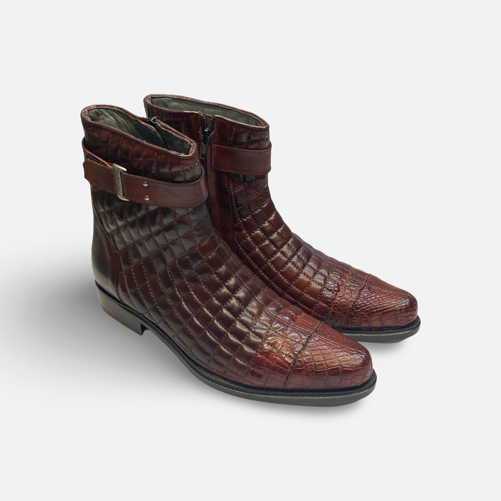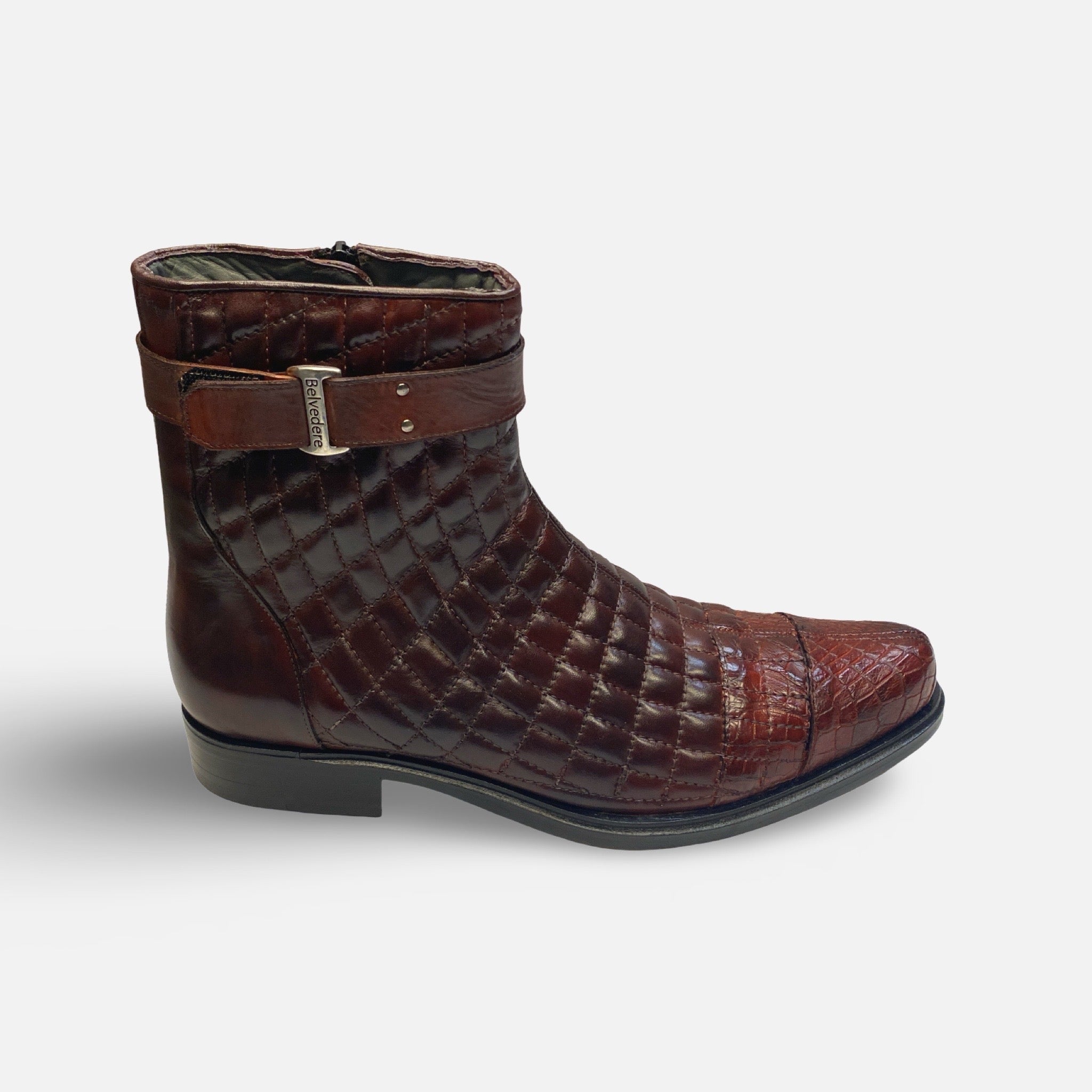 Step into luxury with the Men's Belvedere Shoes Libero Quilted Alligator/Calf Boot in a rich burgundy color. Style #819PJTV combines sophisticated design with unmatched comfort, featuring soft quilted calf leather that hugs the foot perfectly. The striking alligator toe adds a unique flair, making these boots a standout choice for the discerning gentleman. With a convenient side zip, slipping in and out of these stylish boots is effortless. Elevate your wardrobe with the Libero boot—where elegance meets exceptional craftsmanship.