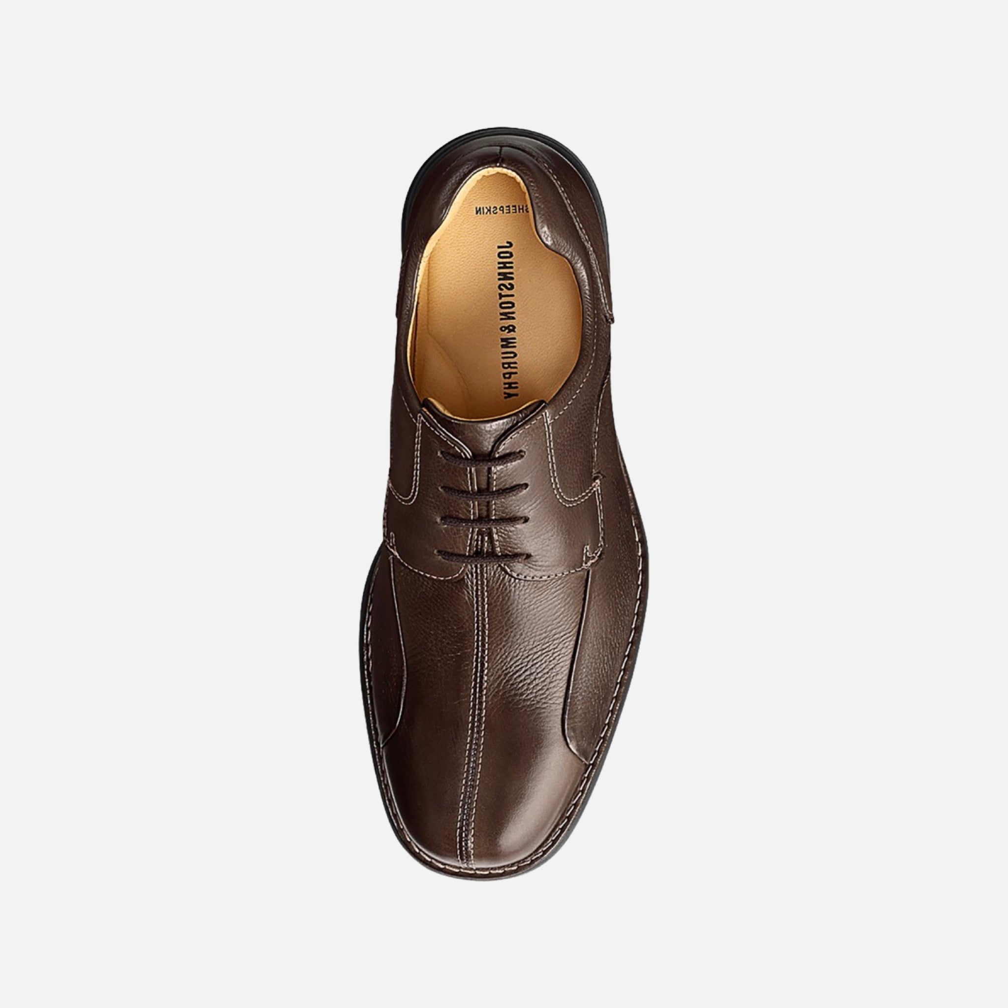 Men's Brown shoe "Shuler" by Johnston & Murphy. Crafted from supple full-grain leather, this shoe features a timeless bicycle toe design and a super-soft sheepskin lining for a comfortable fit and feel. The multi-layered sheepskin footbed and extra padded tongue and collar provide cushioned comfort, making this shoe perfect for all-day wear. The molded latex rubber sole adds flexibility, ensuring a comfortable and supportive fit with every step.