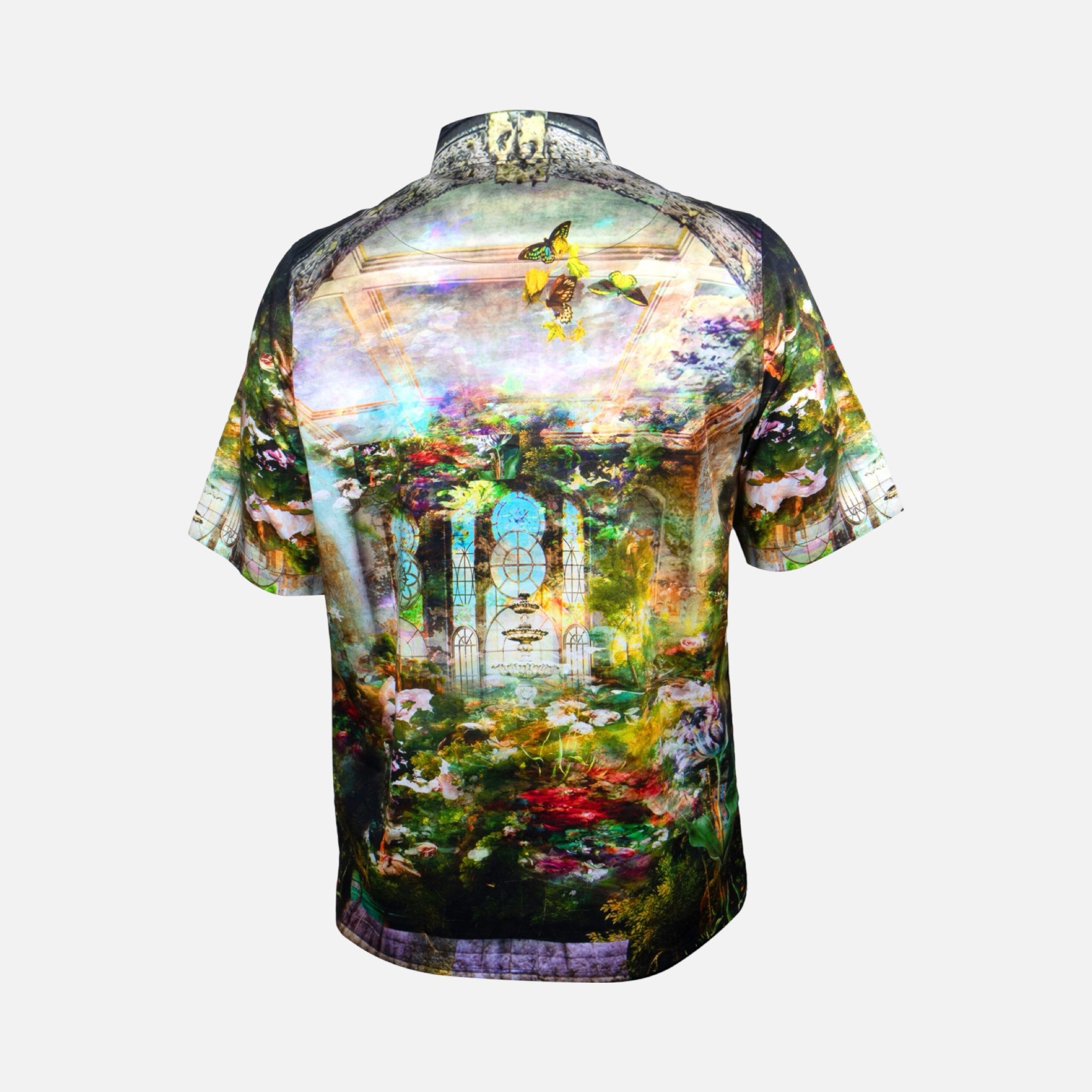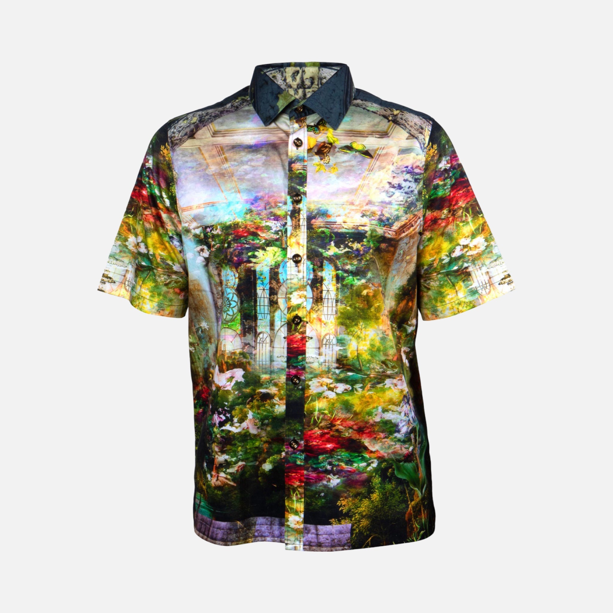 Elevate your style with this summer fashion shirt by Prestige. This artistic multi color shirt has beautiful hues of green, red, blue, purple, beige, and brown. Easy coordinate with your shoes and pants.
