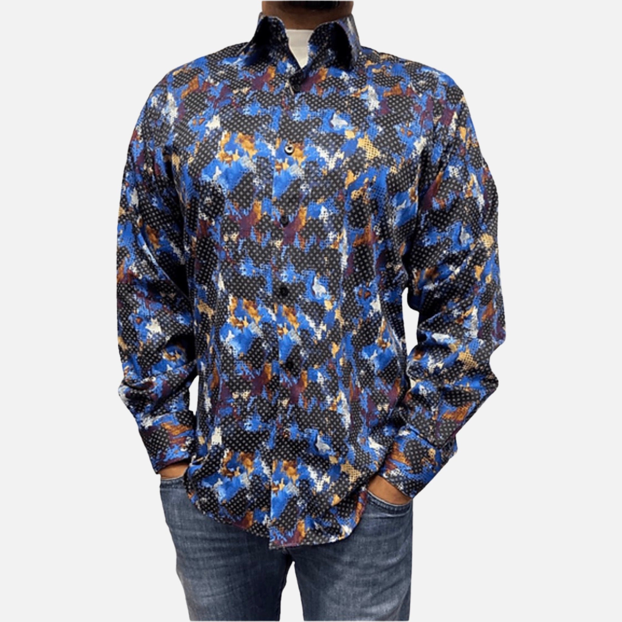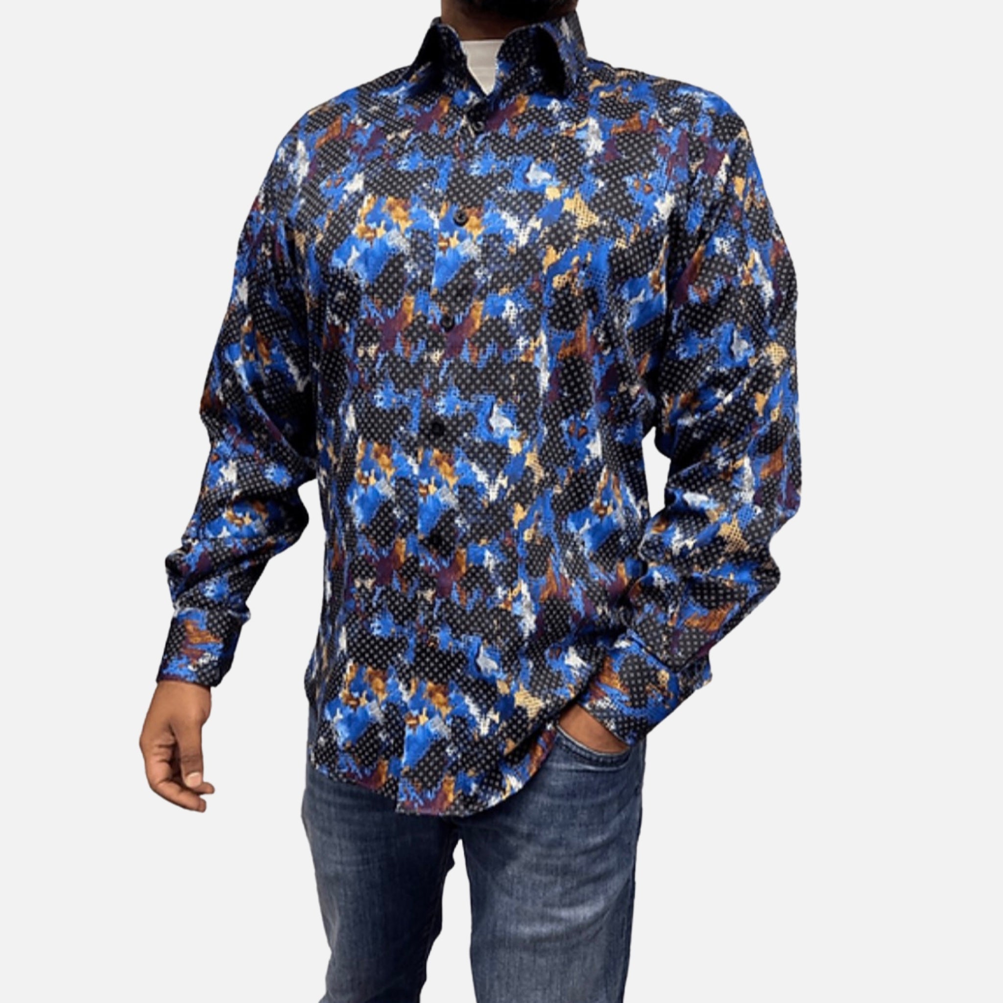 Looking for a stylish navy blue button-down shirt for men? Check out Luchiano Visconti's 4756 sports shirt, perfect for any occasion. Made with a blend of 98% cotton and 2% spandex, this shirt is both comfortable and versatile. Featuring beautiful shades of blue, rust, white, and black, it's easy to pair with jeans, dress slacks, suits, or blazers. The contrast bottom side edge and inner cuff trimming add unique detailing to this already classy shirt. Made in Turkey, this Luchiano Visconti shirt is a must-have for any fashion-forward man's wardrobe. Browse our men's clothing collection today!