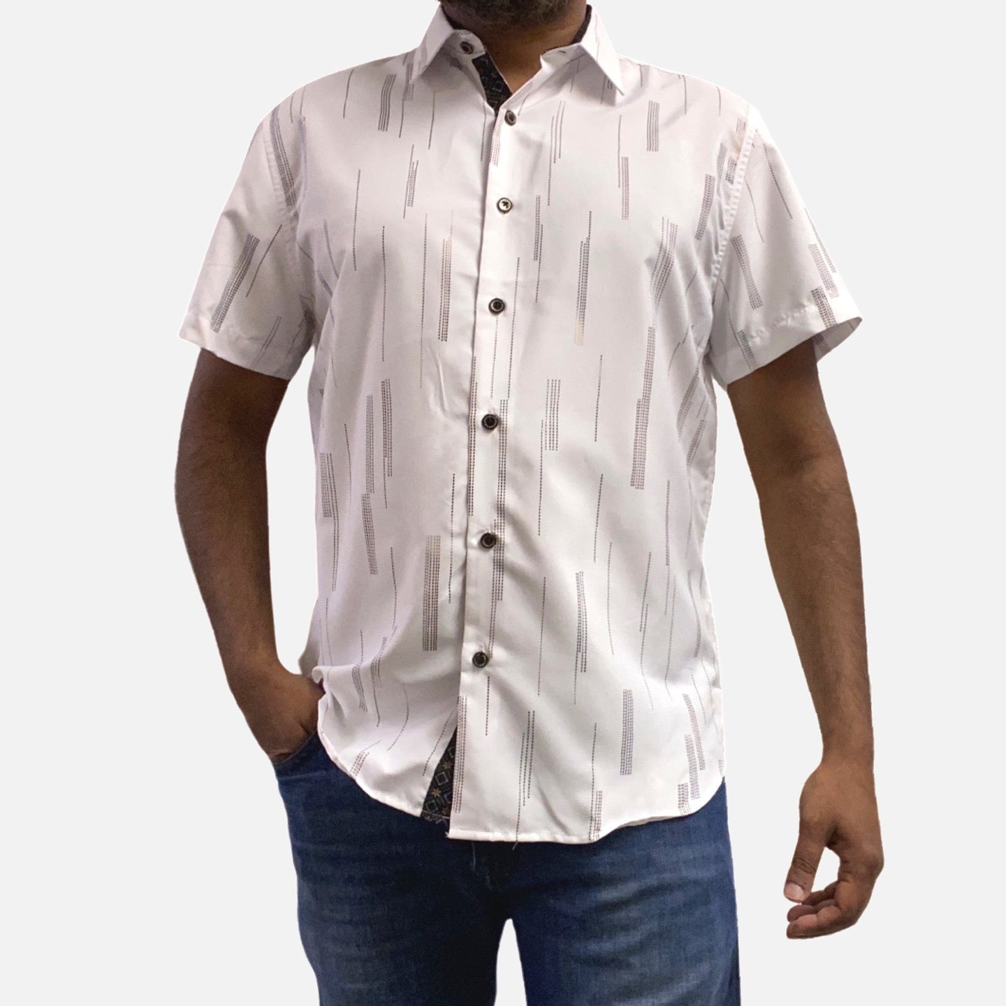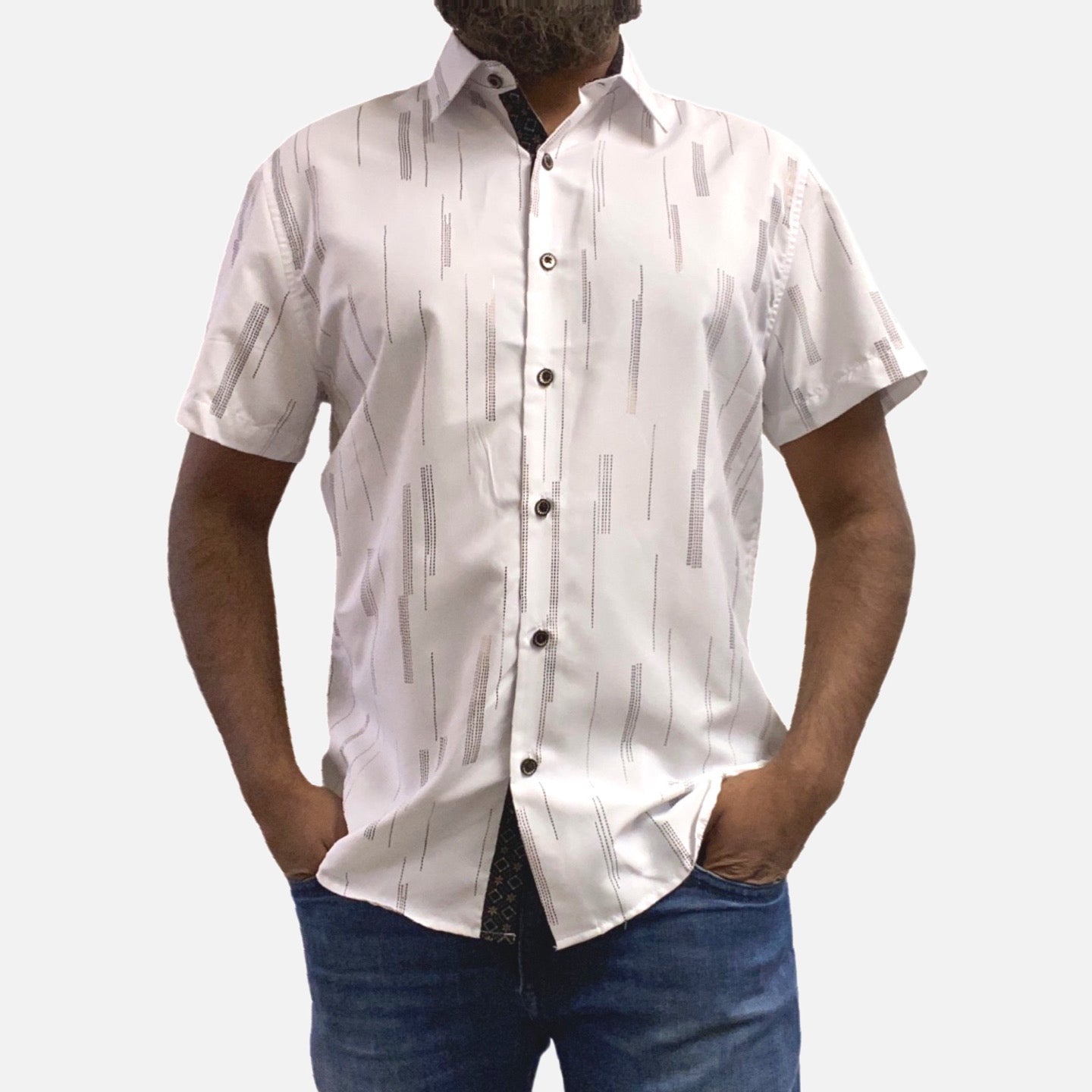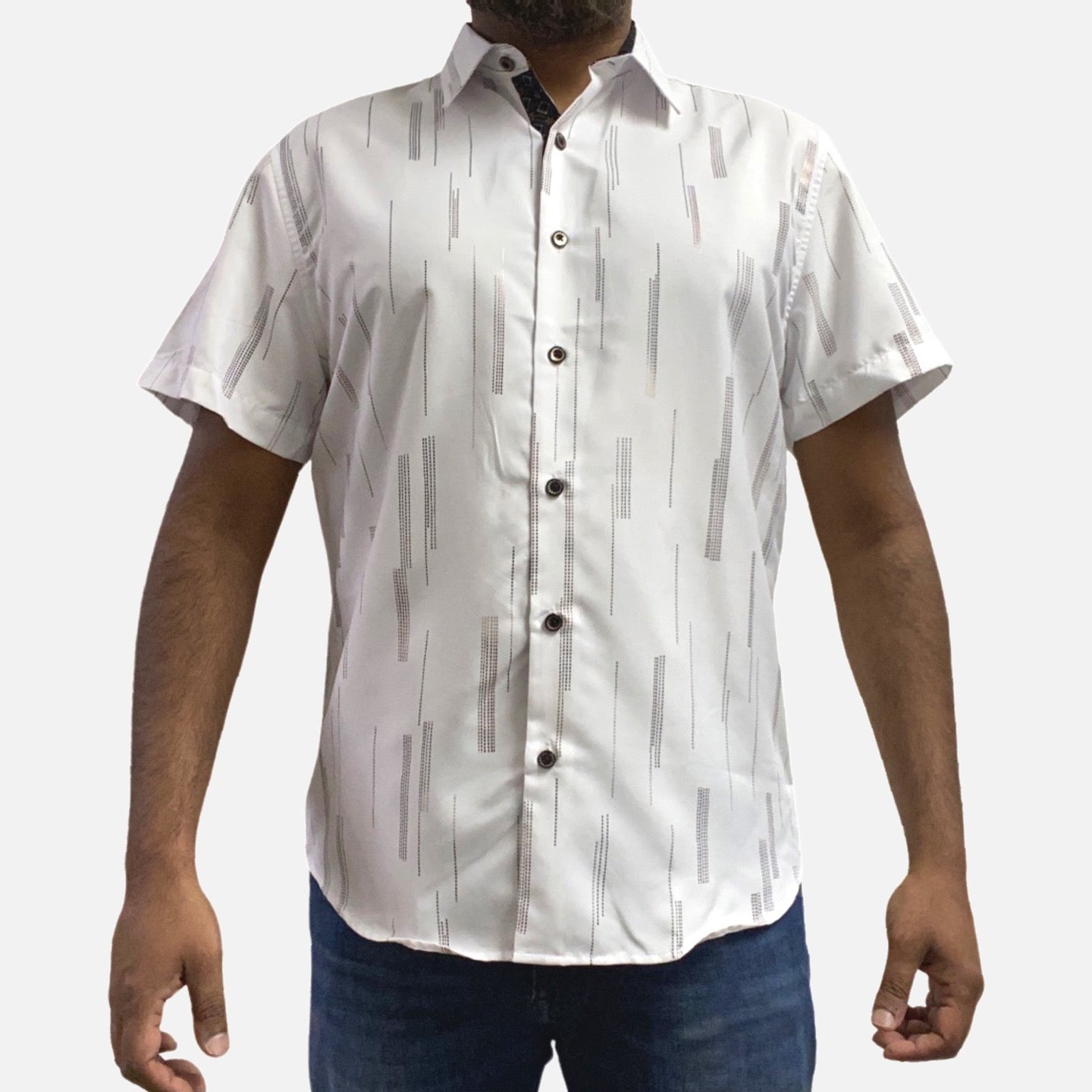 This Men's White Short Sleeve Summer Shirt MSF-2106 is a stylish and comfortable slim fit shirt for summer days. It features contrast placket trimming and inner collar band detailing, plus a subtle dashed lined pattern for a classy fashion look. Perfect for any occasion.