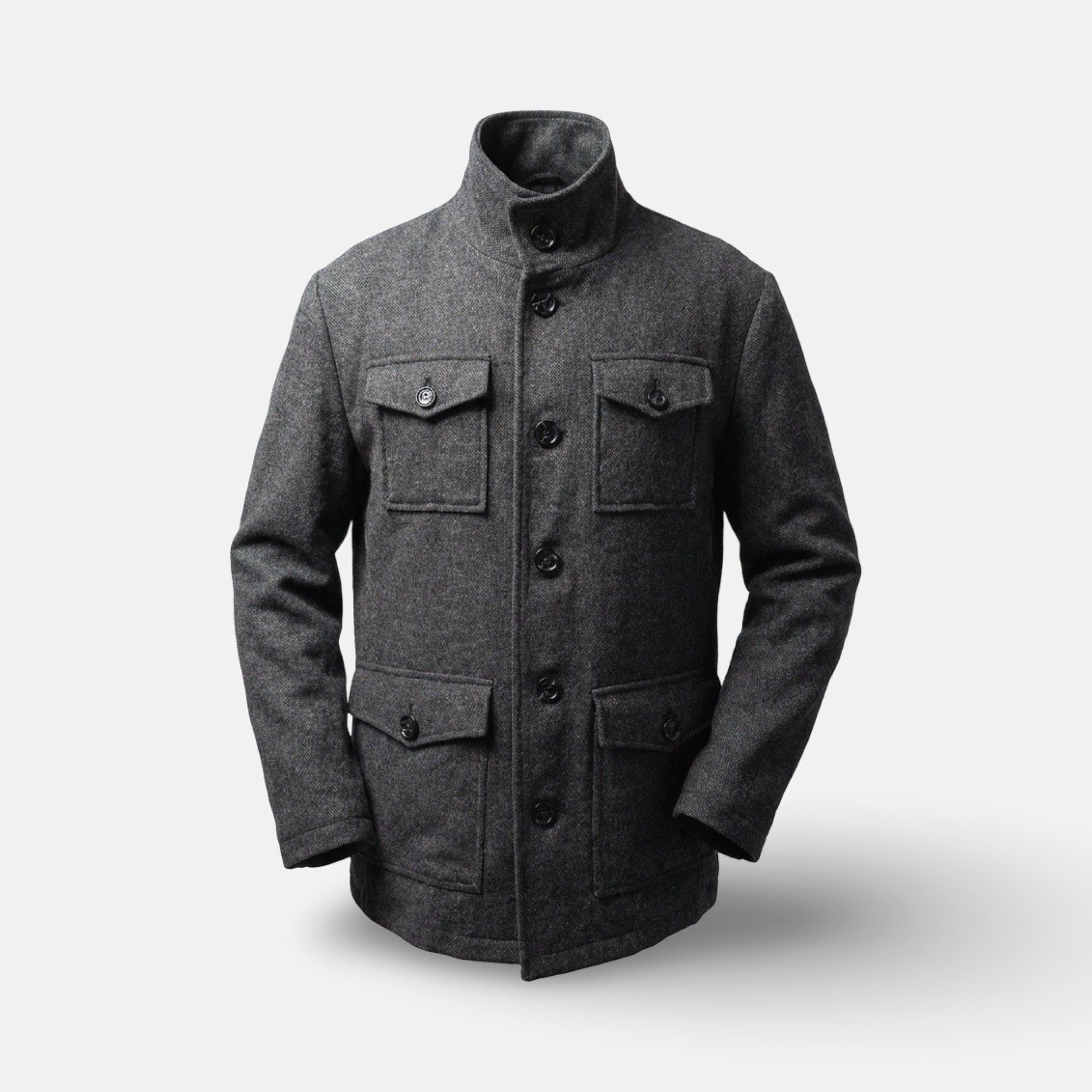 A timeless cold-weather essential, this men’s charcoal field coat blends classic structure with everyday versatility. Crafted from a warm wool-blend fabric, it features a stand collar, full button front, and four functional flap pockets for a refined yet practical look.
