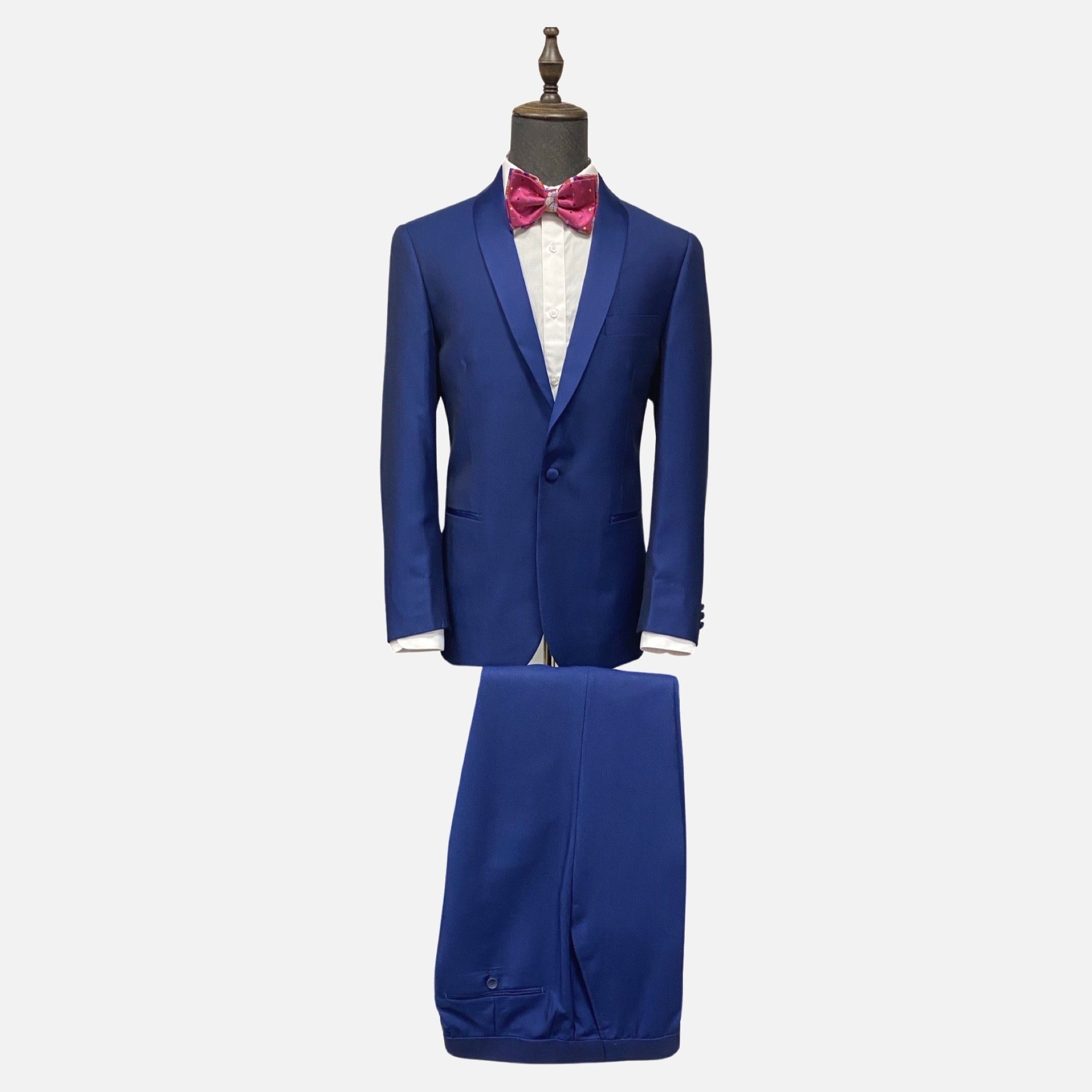 Make a statement at formal events with the Modern Blue Pin Dot Tuxedo featuring a sophisticated shawl collar. The subtle pin dot pattern adds a touch of refinement to the deep blue hue, creating an ensemble that seamlessly blends classic and contemporary styles. The flat front pants contribute to a sleek and tailored look, while the modern fit ensures both comfort and a fashion-forward silhouette. Crafted from a quality blend of 55% viscose and 45% polyester, this tuxedo offers a luxurious feel and durability.