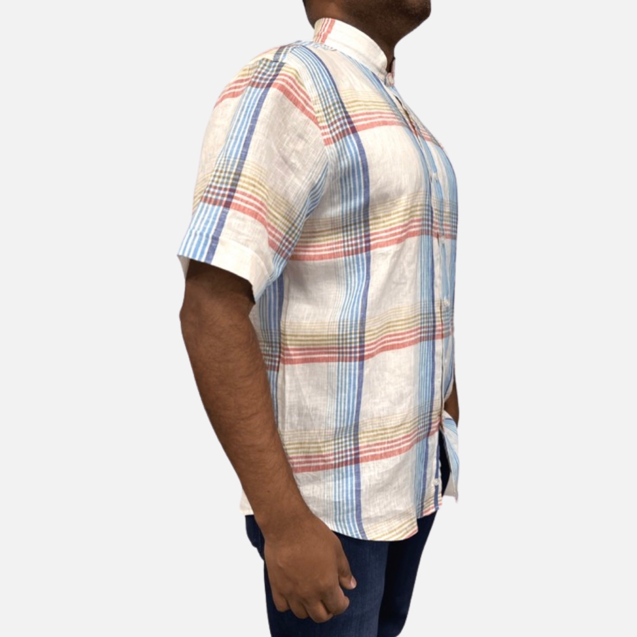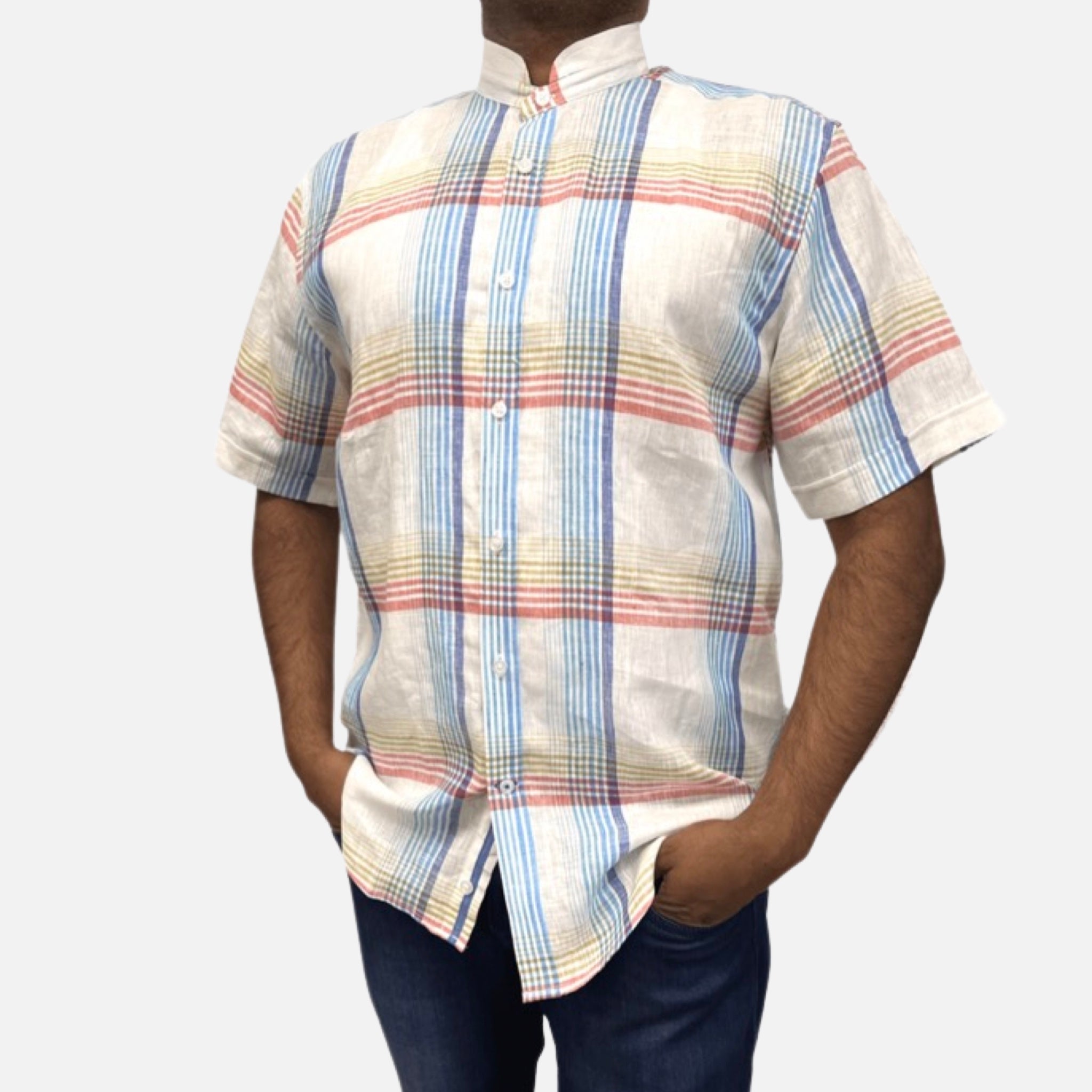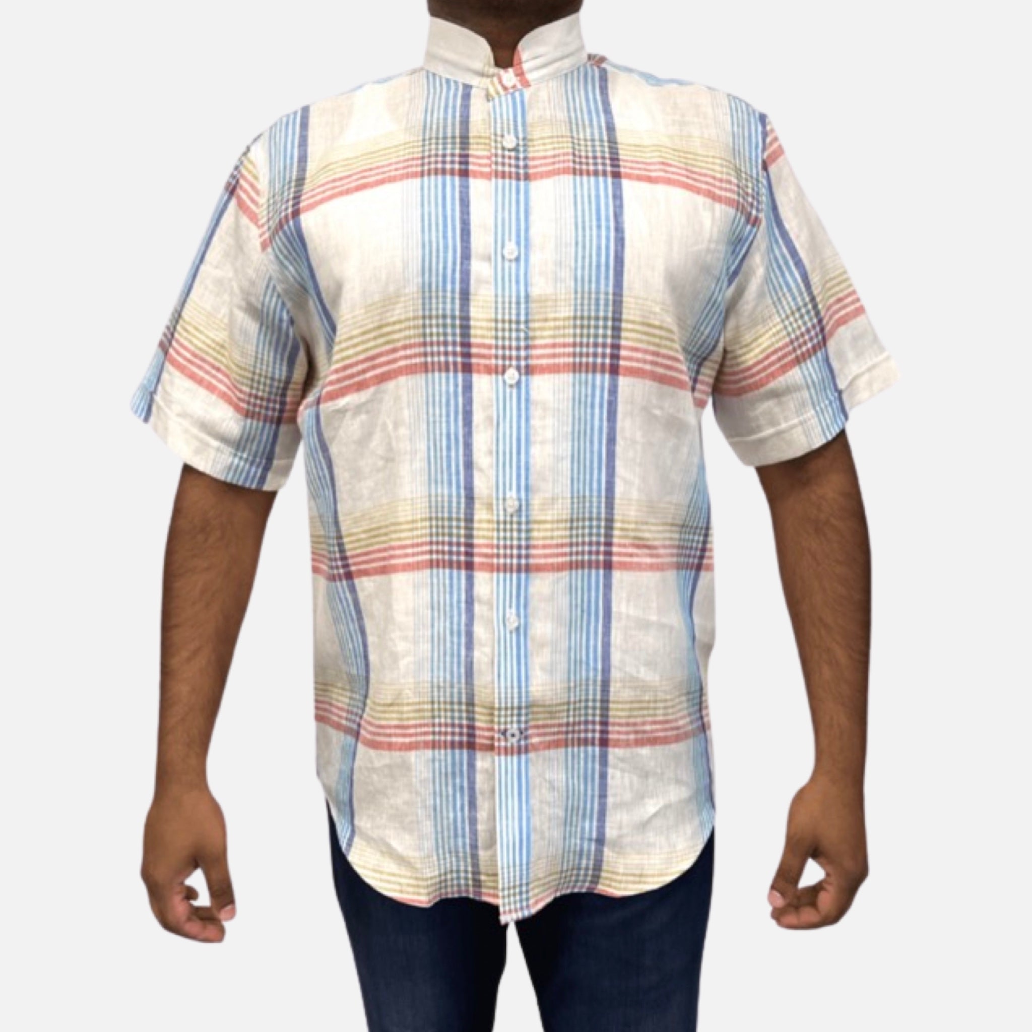 For summer menswear a linen shirt is a must. This mens White multi Color linen shirt is versatile in style and make. Nice lightweight linen, ideal summer mens clothing fabrication. White multi color pull over linen shirt, with buttons.