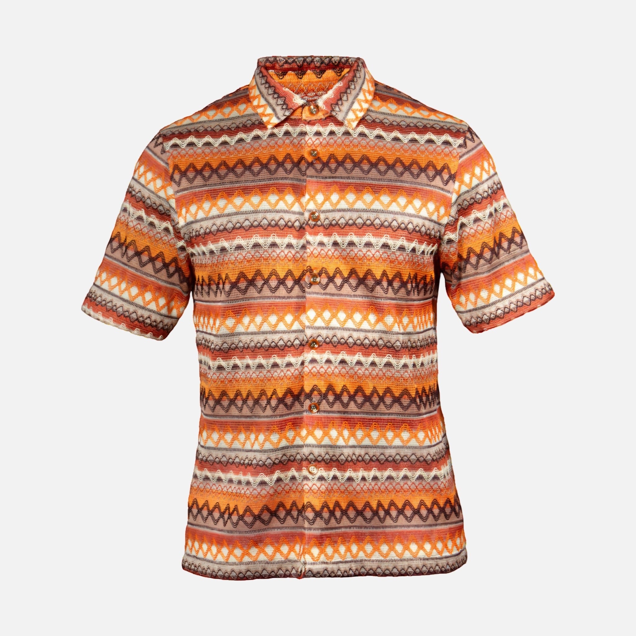 Elevate your style with the Prestige Men’s Short Sleeve Knit Button-Up Shirt, a perfect blend of retro charm and modern comfort. Crafted from soft and breathable rayon knit, this shirt features a vibrant geometric pattern in warm earth tones, making it a standout piece for any occasion. The short sleeves and classic button-up design provide a relaxed yet refined fit, ideal for casual outings, summer events, or vacation wear.