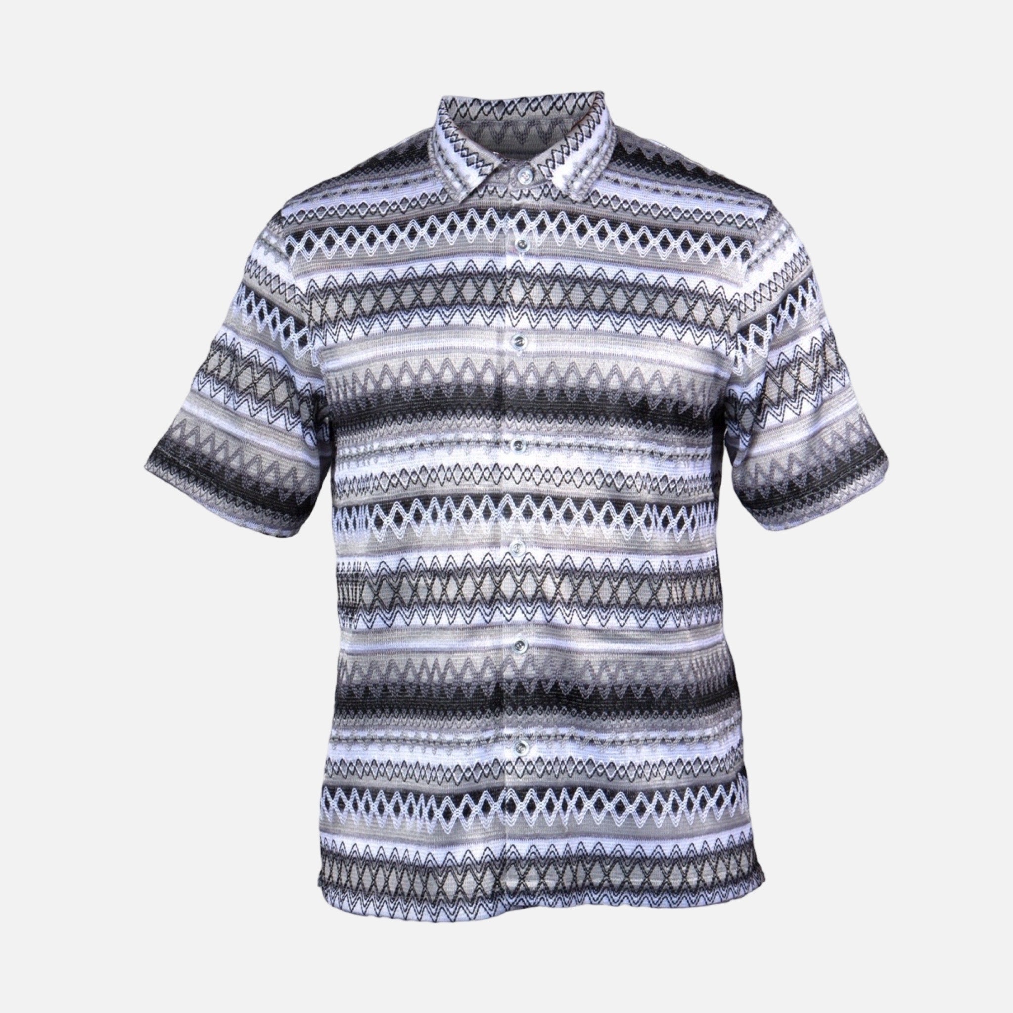 Elevate your style with the Prestige Men’s Short Sleeve Knit Button-Up Shirt, a perfect blend of retro charm and modern comfort. Crafted from soft and breathable rayon knit. This white shirt has nice elegant gray and black tones. The short sleeves and classic button-up design provide a relaxed yet refined fit, ideal for casual outings, summer events, or vacation wear.