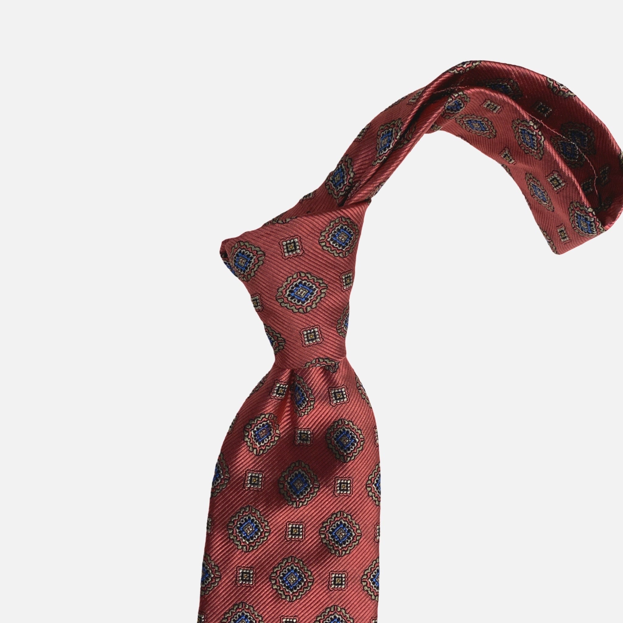 Add a touch of classic flair to your look with this handmade 100% silk tie. Featuring a rich brick red base with an alternating medallion pattern in shades of blue, gold, and black, this tie offers a perfect blend of color and sophistication. The silk fabric has a soft luster and elegant drape, making it ideal for both professional settings and formal occasions. A refined accessory for those who appreciate timeless style with bold characte